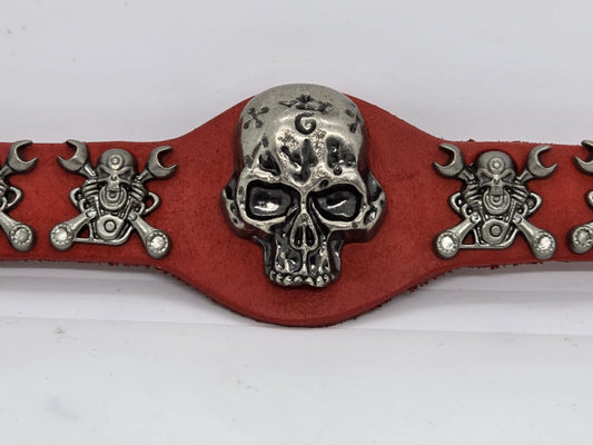 Red Leather Adjustable Skull Motor Wrench UNISEX Bracelet (sku8325)