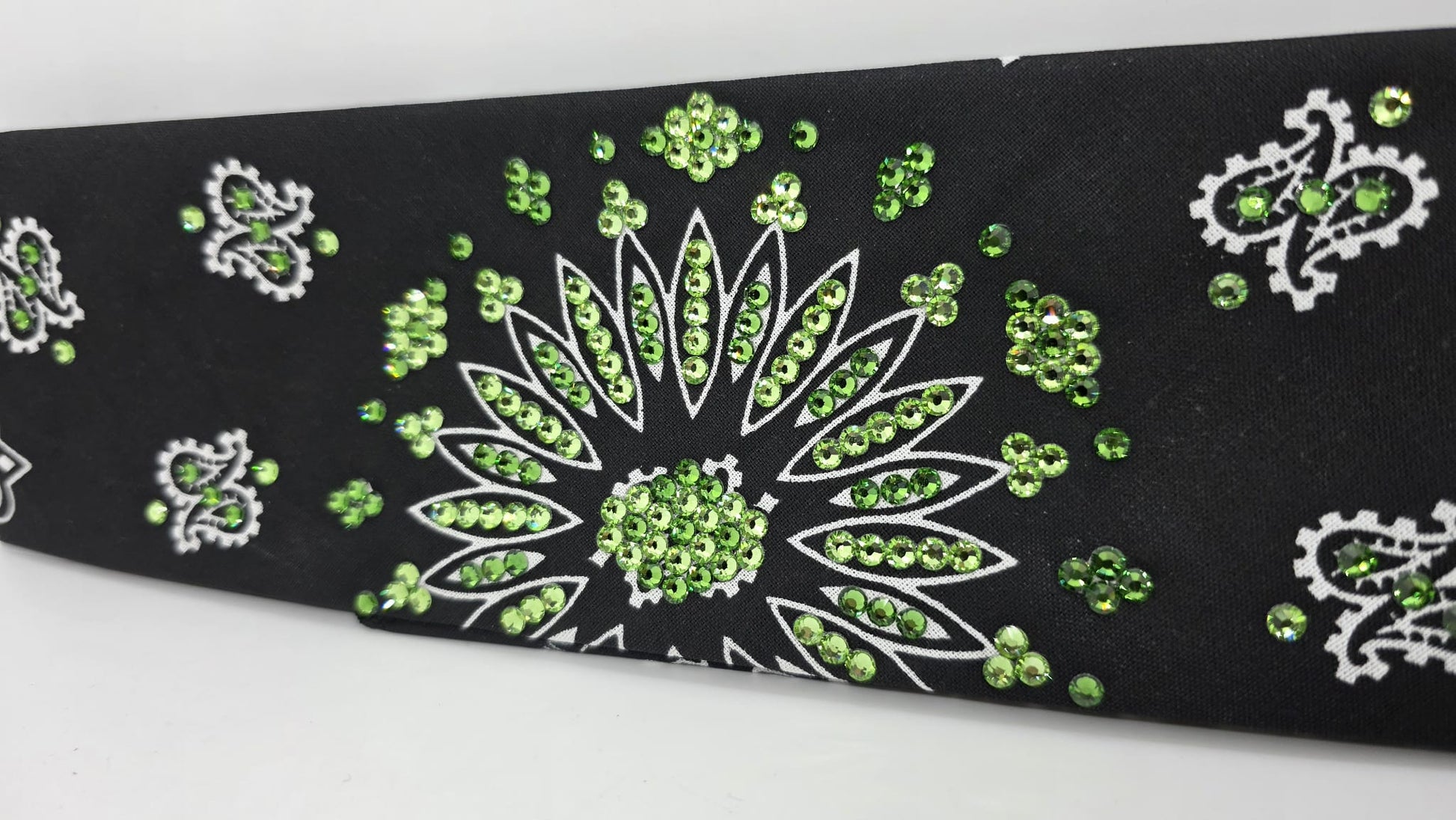Elevate your accessory collection with this Black Paisley Bandana, featuring Light and Dark Green Austrian Crystals meticulously arranged across a luxurious 22-inch square. Handcrafted in the USA, the commanding 3 1/4-inch crystal-adorned border exemplifies superior artisanal excellence and refined construction. The thoughtfully positioned crystals deliver captivating visual interest while reserving space for your personal design additions and creative customization. The classic paisley pattern harmonizes seamlessly with the luminous green crystal accents, transitioning effortlessly between everyday sophistication and elevated occasions. Maintain optimal condition with gentle hand washing or delicate machine cycles using a lingerie bag, then lay flat to air dry. A gentle iron applied to the reverse side—carefully sidestepping the crystals—restores its refined finish. Built for enduring wear and timeless elegance, this piece offers lasting value for those who demand distinctive, premium-quality accessories.