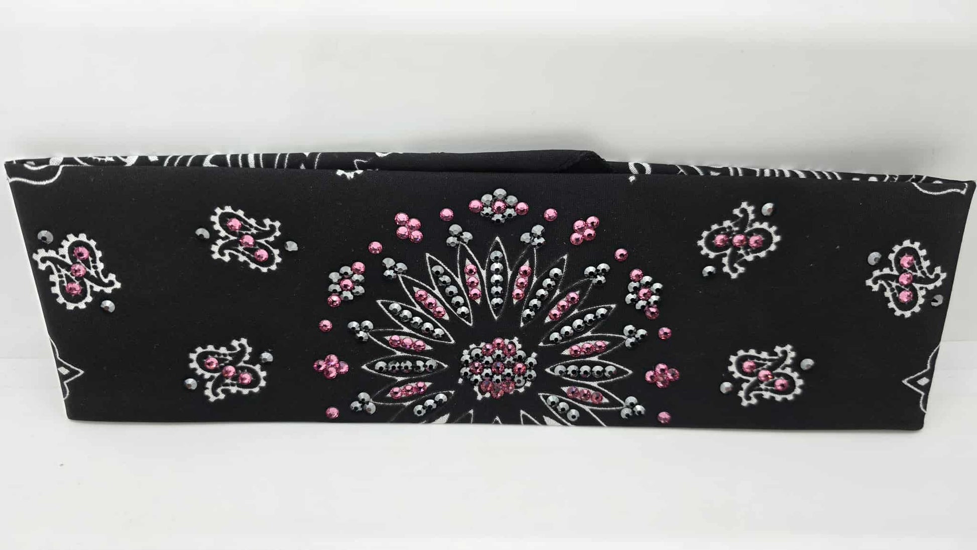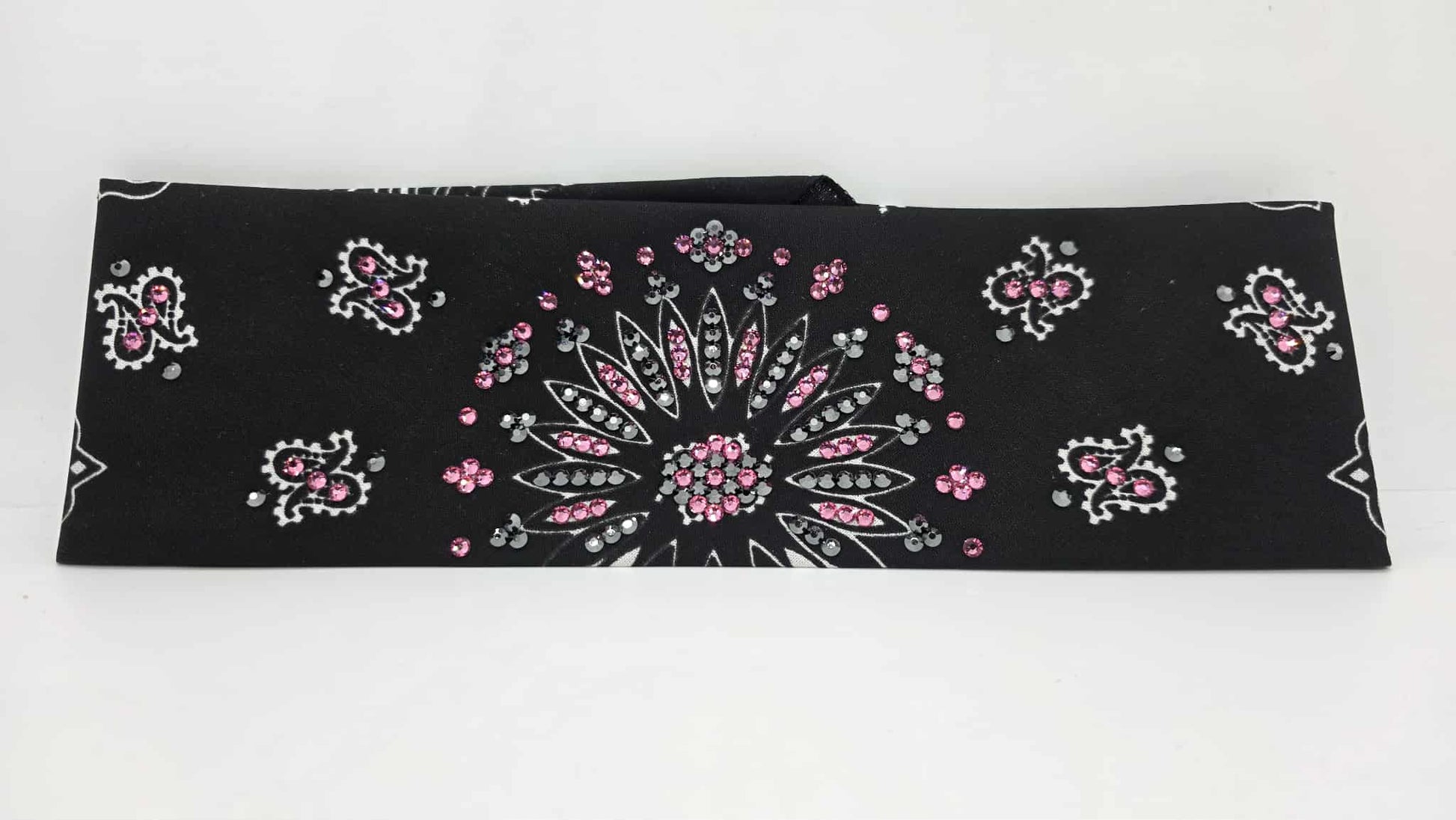 EXTRA BLING - Black Paisley Bandana with Black and Rose Austrian Crystals (sku6405)