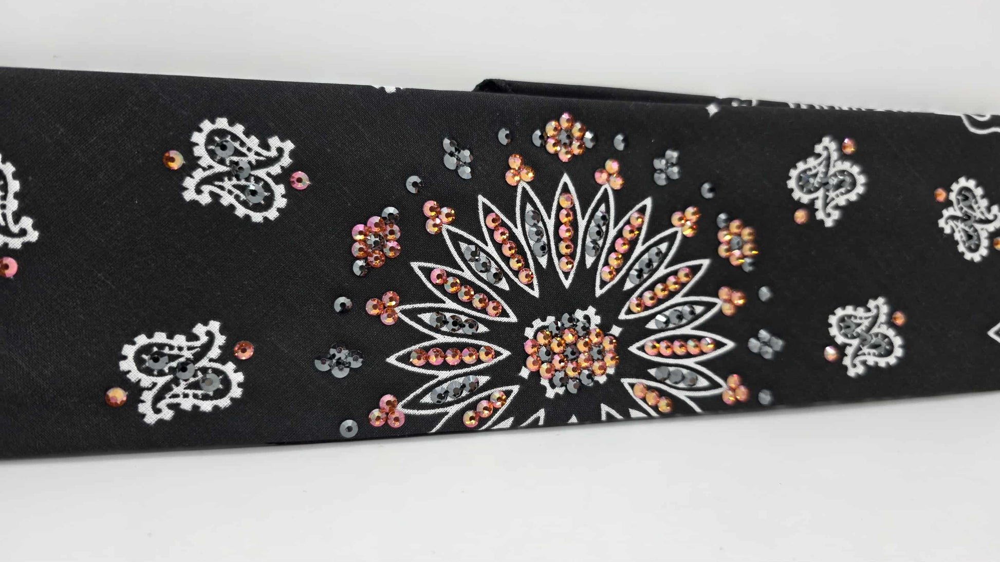 This Black Paisley Bandana features stunning Lava and Black Austrian Crystals meticulously applied across its 27-inch square design. Crafted in the USA with exceptional attention to detail, the approximately 3 1/4-inch-wide embellished band creates a sophisticated statement piece. The customizable crystal placement allows you to enhance your personal style further. Maintain its pristine condition through gentle hand washing or cold machine washing in a lingerie bag, then lay flat to dry. A light iron on the reverse side—carefully avoiding the crystals—keeps the fabric crisp. This durable accessory combines elegance with practicality for everyday wear.