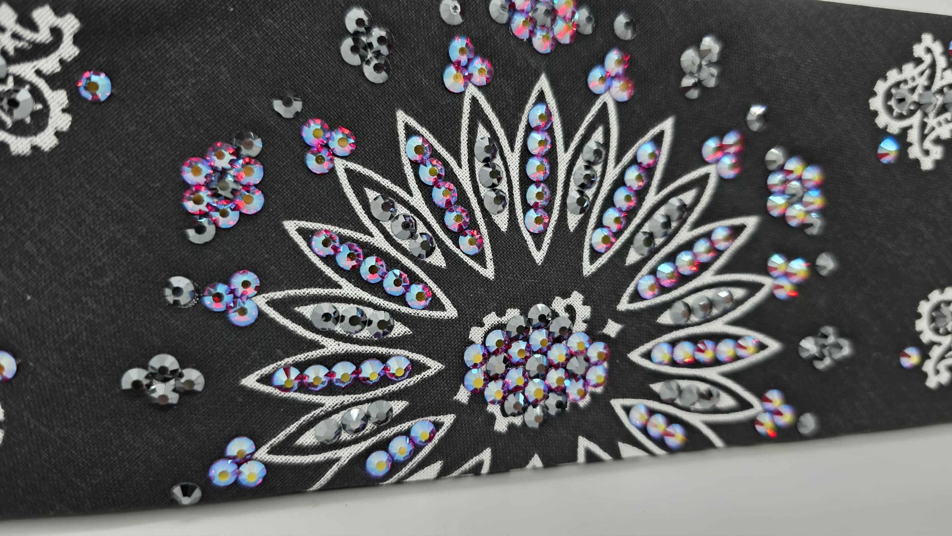 Discover understated luxury with this Black Paisley Bandana, where Red Shimmer and Black Austrian Crystals are expertly positioned across a spacious 27-inch square format. Proudly manufactured in the USA, the 3 1/4-inch crystal-adorned band delivers sophisticated style without compromise. The thoughtfully engineered design accommodates additional crystal embellishments, giving you the flexibility to personalize and evolve your accessory. Maintain its beauty through gentle hand washing or delicate cold machine cycles using a lingerie bag, followed by flat drying. For optimal results, apply a light iron to the back while protecting the crystal details. A refined, durable accessory that seamlessly complements both everyday looks and elevated occasions.
