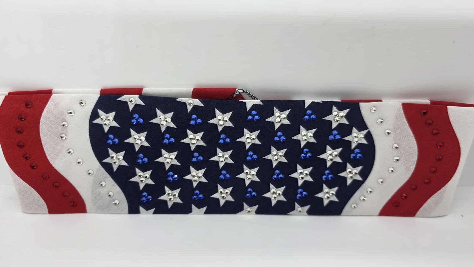 Made in the USA, this Flag Bandana featuring Red, Blue, and Diamond Clear Austrian Crystals measures about 3 1/4 inches wide and highlights superior craftsmanship and elegant design. It offers customization with additional crystals to enhance its unique appeal. Built for longevity, it can be hand washed or gently machine washed on cold inside a lingerie bag and laid flat to dry to preserve shape and quality. Light ironing on the reverse side, avoiding crystals, keeps it looking sharp. Note that normal wear and washing may cause gradual fading, which is not covered by our guarantee. Ideal for those valuing refined artistry, this bandana lends a sophisticated touch to any ensemble, either as a bold statement or subtle accent, making it a versatile and cherished accessory. Thank you for selecting this expertly made piece.
