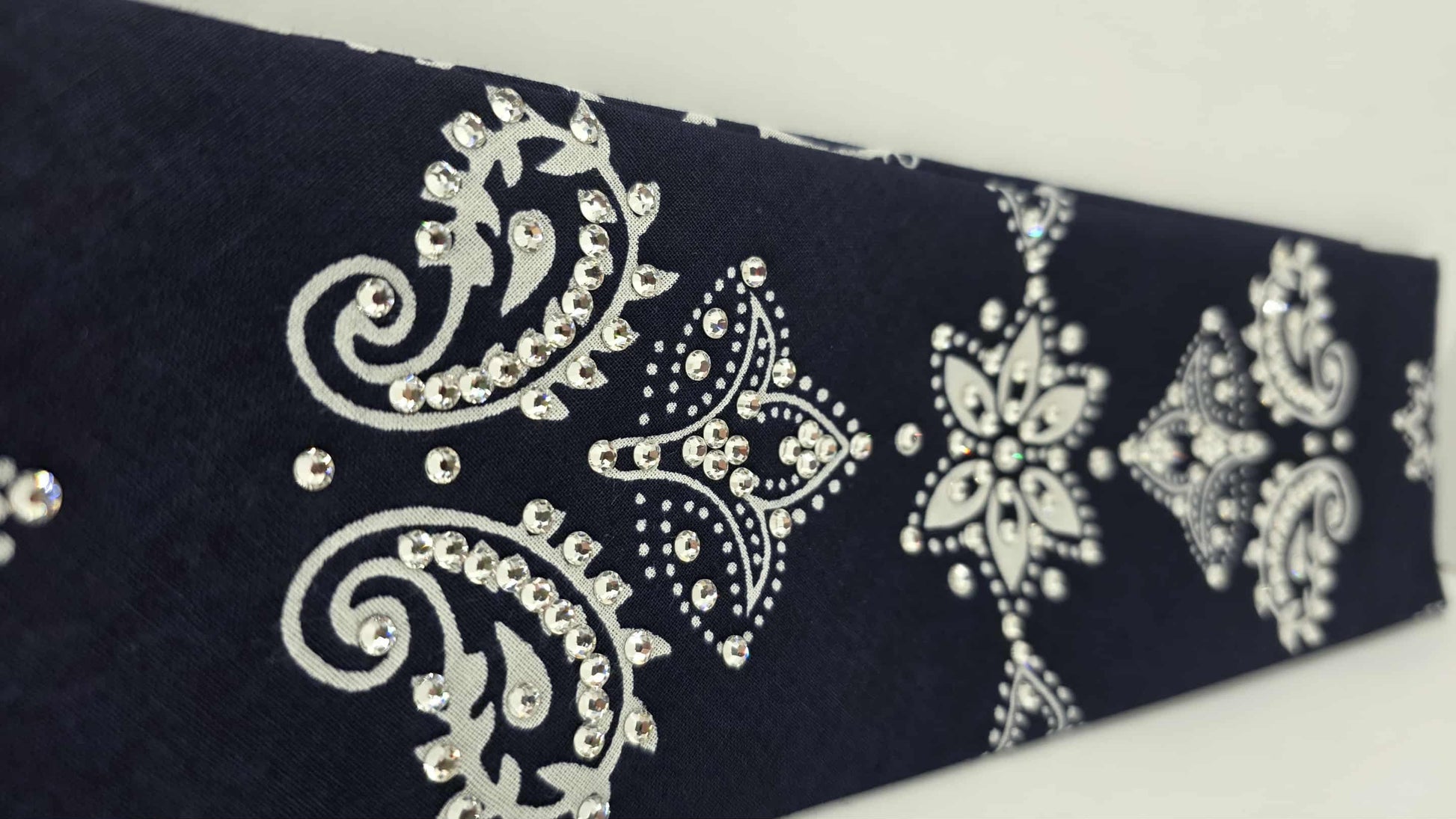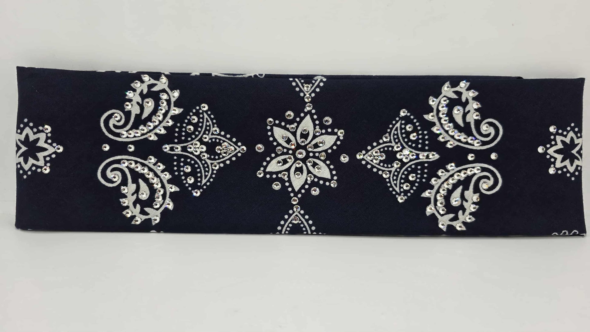 Made in the USA, this Large Navy Blue Flower Bandana features black and diamond-clear Austrian crystals and measures about 3 1/4 inches wide. Its detailed design allows for adding extra crystals to customize your look. Built to last, it can be hand washed or gently machine washed on cold inside a lingerie bag, then laid flat to dry to preserve its form. Light ironing on the reverse side, avoiding the crystals, restores its neat appearance. Standard wear and washing may cause slight fading, not covered by the satisfaction guarantee. Sized at 27 inches square, this refined bandana offers a versatile and elegant accessory. Thank you for selecting this quality piece.