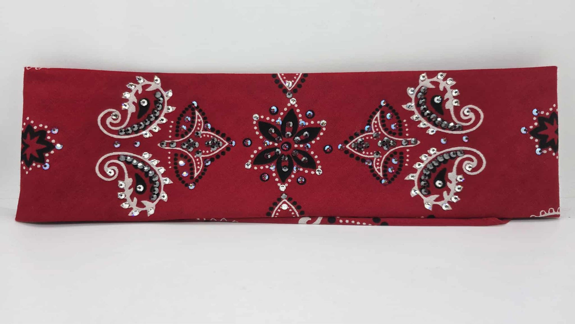 Made in the USA, this Large Red Flower Bandana features red shimmer fabric adorned with black and diamond-clear Austrian crystals, measuring about 3 1/4 inches wide. Its detailed craftsmanship allows for optional customization by adding more crystals to enhance its unique style. Built for lasting wear, it can be hand washed or gently machine washed on a cold cycle inside a lingerie bag, then dried flat to preserve its form. Light ironing on the reverse side, avoiding the crystals, maintains its polished finish. Note that natural wear and washing may cause gradual fading, excluded from the satisfaction guarantee. With a 27-inch square size, this elegant bandana delivers a refined touch suitable for bold or subtle fashion statements. Thank you for selecting this expertly crafted piece.