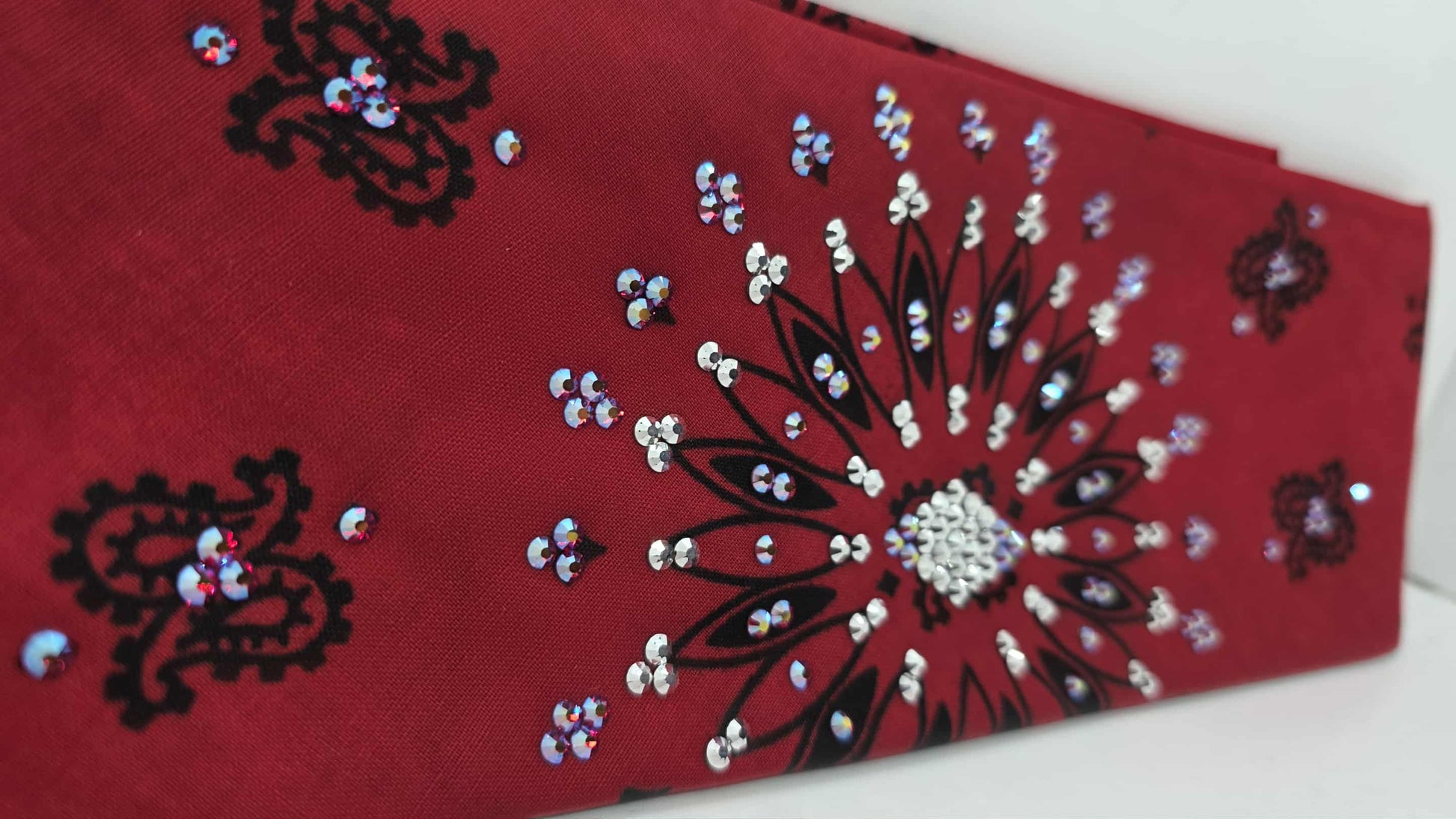 This Large Red Paisley Bandana showcases Red Shimmer and Chrome Austrian Crystals, measuring approximately 3 1/4 inches wide for a sophisticated and unique detail. The Red Shimmer crystals display a captivating color-shifting effect with shades of red and blue. The detailed design allows for additional customization by adding more crystals to enhance its exclusive look. Built for lasting quality, the bandana can be hand washed or gently machine washed on a cold, delicate cycle inside a lingerie bag to protect both fabric and embellishments. After cleaning, lay it flat to dry to preserve its shape and prevent distortion. For a sleek finish, gently iron on the reverse side, avoiding direct contact with the crystals. At 27 inches square, this bandana offers a versatile and stylish accessory suitable for making both bold statements and subtle additions to any outfit. Please be aware that natural fading may occur over time with wear and washing, which is not covered by the satisfaction guarantee. This finely crafted accessory combines classic elegance with personalization options, providing a durable and fashionable addition to your collection. Thank you for selecting this expertly crafted piece.