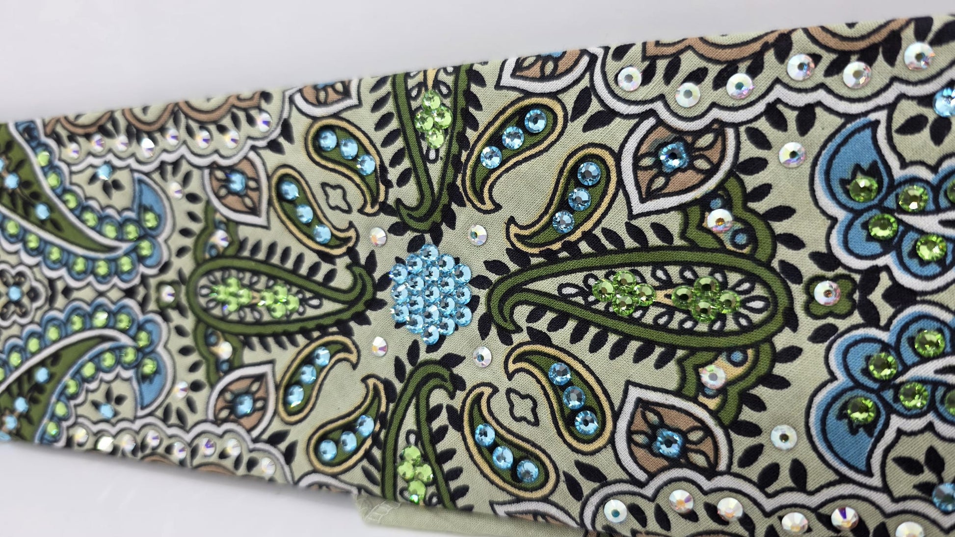 Crafted with meticulous attention to detail in the USA, this Mint Indian Bandana showcases a stunning array of Aqua, Peridot, and Aurora Borealis Austrian Crystals. Spanning approximately 3 1/4 inches in width, this sophisticated accessory welcomes customization—add complementary crystals to create a truly distinctive piece that reflects your personal style. Maintain its brilliance through gentle hand washing or delicate cold cycles in a lingerie bag, followed by flat drying. Light ironing on the reverse side is permissible when steering clear of the crystal embellishments. Please understand that natural fading from regular wear and laundering is expected and not covered under our satisfaction guarantee. An expertly engineered accessory that transforms any ensemble.