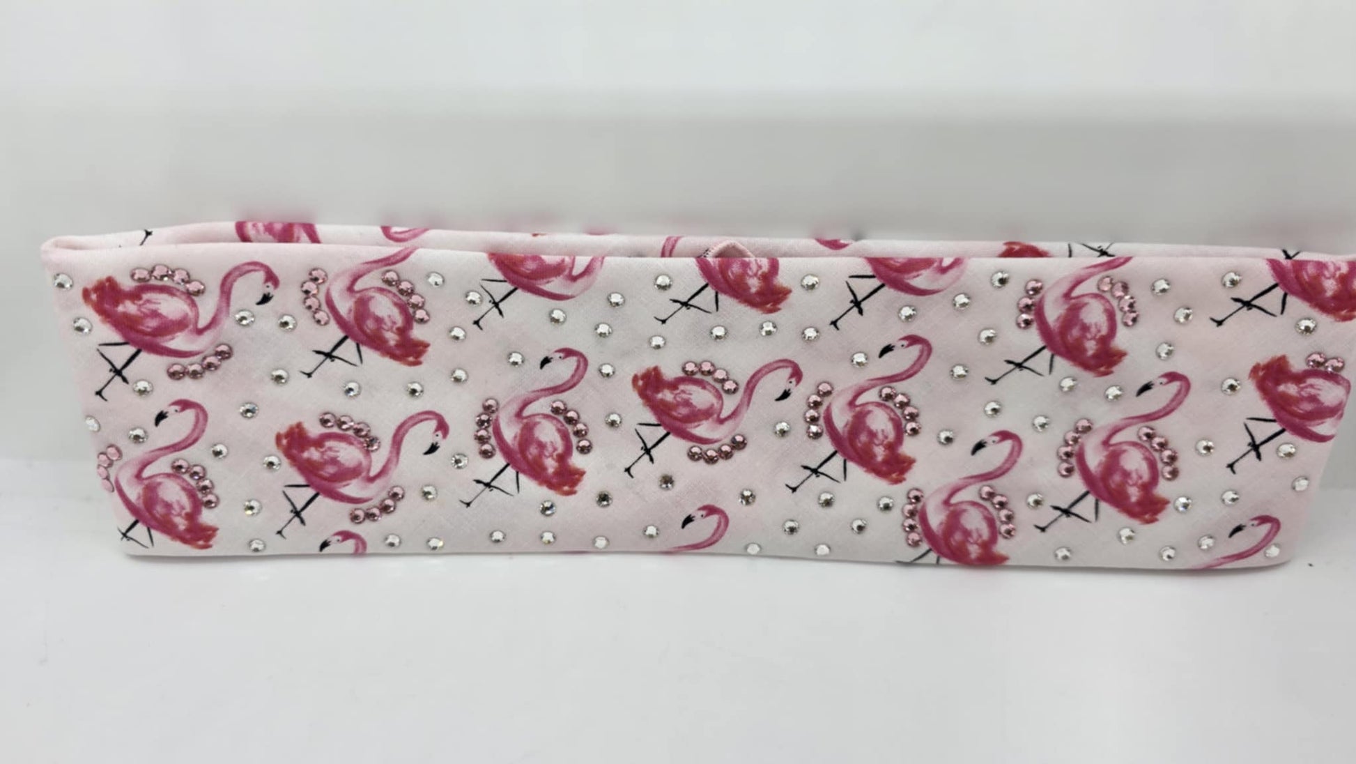 Crafted in the USA with meticulous attention to detail, this Pink Flamingo Bandana measures approximately 3 1/4 inches wide, showcasing a blend of expert craftsmanship and elegant design. It is adorned with pink and diamond-clear Austrian crystals, with the option to add extra crystals for a personalized touch that enhances its sparkle and uniqueness. Made from durable materials, the bandana is easy to maintain—simply hand wash or machine wash on a gentle cold cycle inside a lingerie bag, then lay flat to dry. Light ironing on the reverse side is allowed, provided the crystals are avoided to preserve their brilliance. Please note that normal wear and washing may cause some fading over time, which is not covered by our satisfaction guarantee. This bandana is ideal for those who value refined quality, sophisticated style, and the ability to customize their accessories with a touch of glamour. Thank you for choosing a product that combines durability with exquisite design.