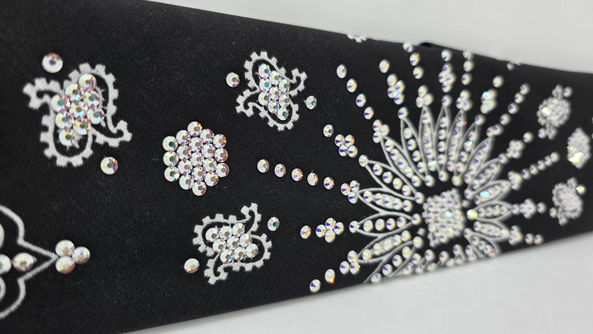 This LeeAnnette bandana combines premium-grade fabric with expert craftsmanship, featuring a striking black paisley motif adorned with Aurora Borealis Austrian crystals. Each crystal is positioned to amplify the pattern's visual complexity, casting prismatic light that shifts with movement. The fabric withstands repeated laundering—both machine and hand wash—without compromising color integrity or structural stability. Equally suited to casual wear or formal settings, this accessory bridges versatility with refined elegance. The deliberate crystal placement and durable construction make it an investment piece for those seeking timeless sophistication and lasting quality in their accessories.