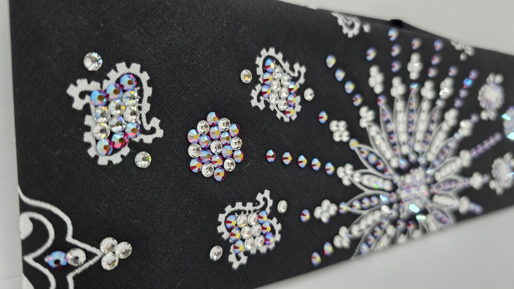 The LeeAnnette Black Paisley Bandana showcases sophisticated craftsmanship with strategically positioned red shimmer and Diamond Clear Austrian crystals that illuminate the intricate paisley pattern with striking brilliance. Built on premium fabric engineered for longevity, this piece resists color degradation and maintains structural integrity across repeated wear and washing—whether machine or hand laundered. The design transcends occasion boundaries, functioning equally well as a casual accent or formal complement, making it an essential accessory for those who prioritize refined aesthetics. Each crystal placement reflects meticulous attention to detail, delivering understated elegance that distinguishes discerning wardrobes without ostentation.