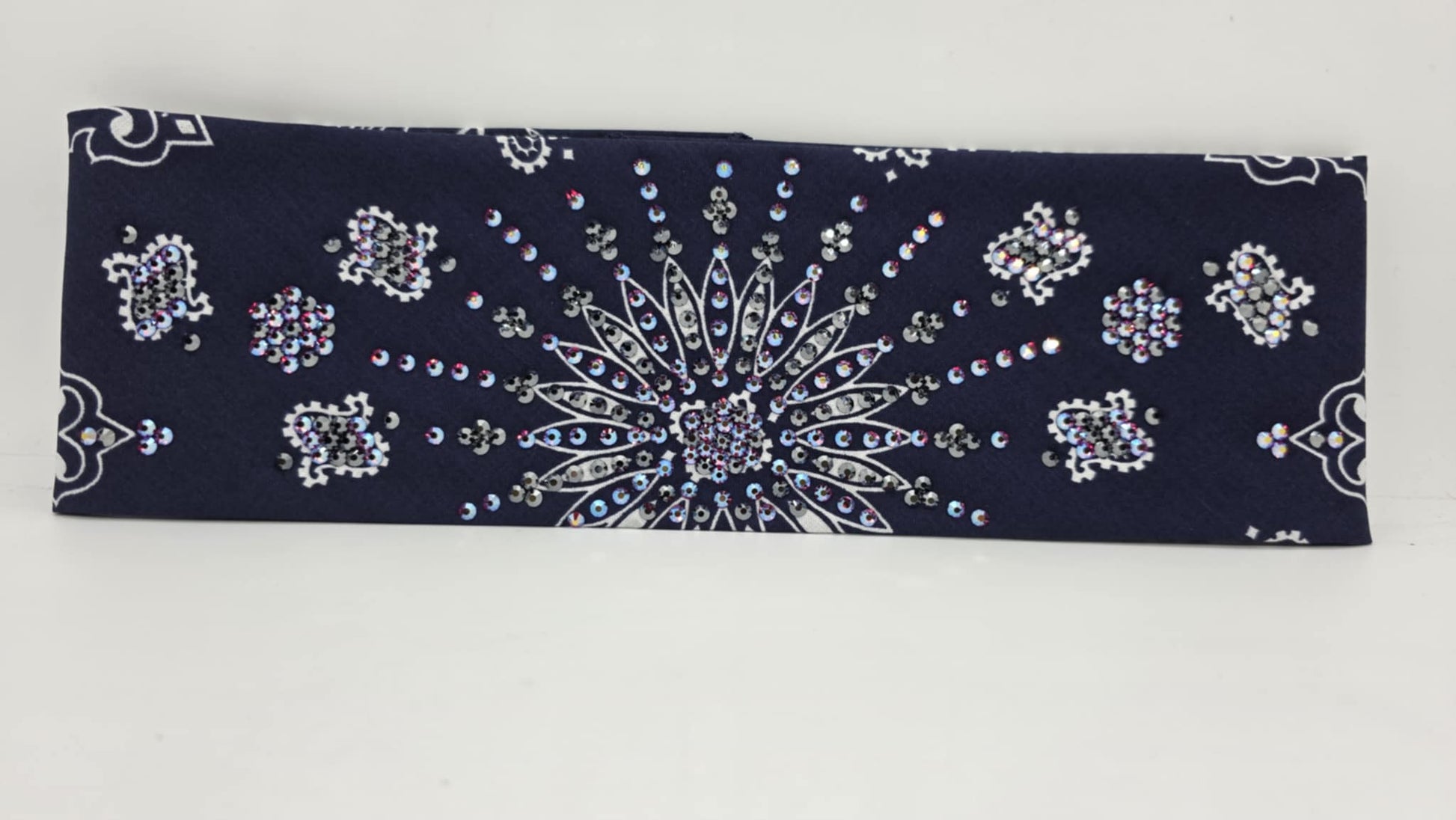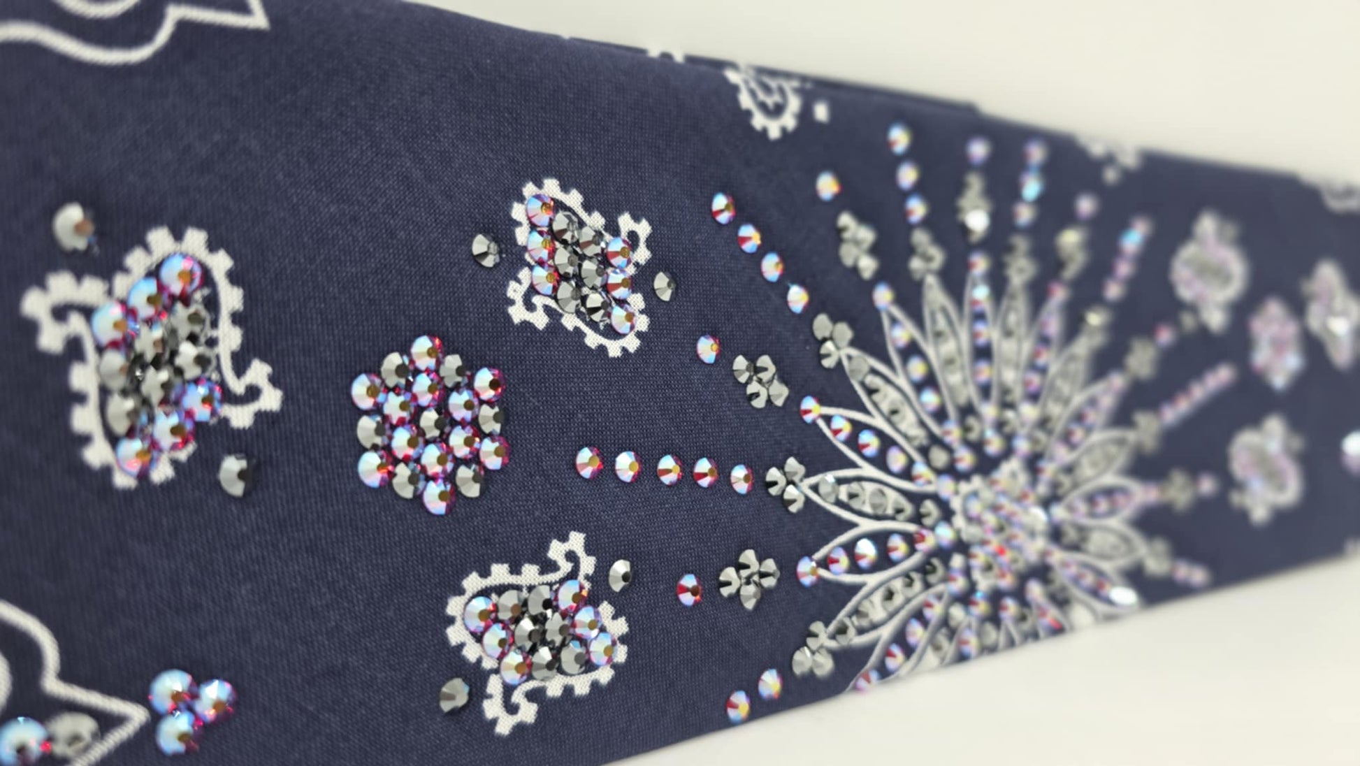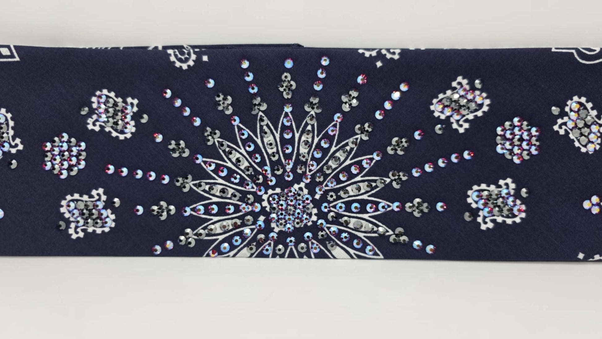 The LeeAnnette Navy Paisley Bandana with Red Shimmer and Black Austrian Crystals exemplifies expert craftsmanship paired with timeless elegance. Adorned with a striking blend of red shimmer accents and rich black crystals, it enhances the intricate paisley design, capturing light to create a dynamic and captivating shimmer. Crafted from premium fabric, the bandana retains its deep navy hue and structured silhouette even after frequent wear, ensuring lasting vibrancy and durability. Engineered for practicality, it is compatible with both machine and hand washing, allowing for effortless care without compromising its sophisticated finish. Designed for discerning individuals who appreciate fine detail and quality materials, this bandana adds a distinguished and versatile accent to any outfit, whether for everyday styling or special occasions.