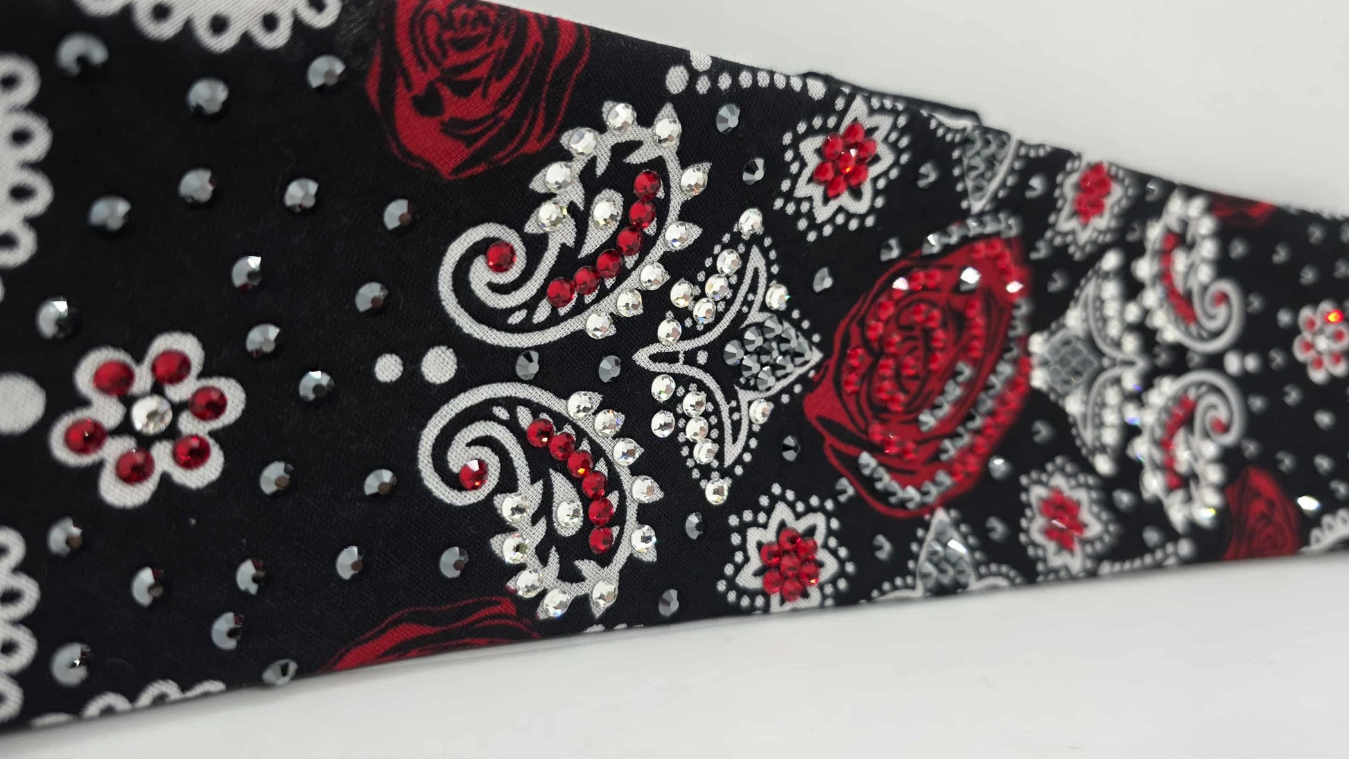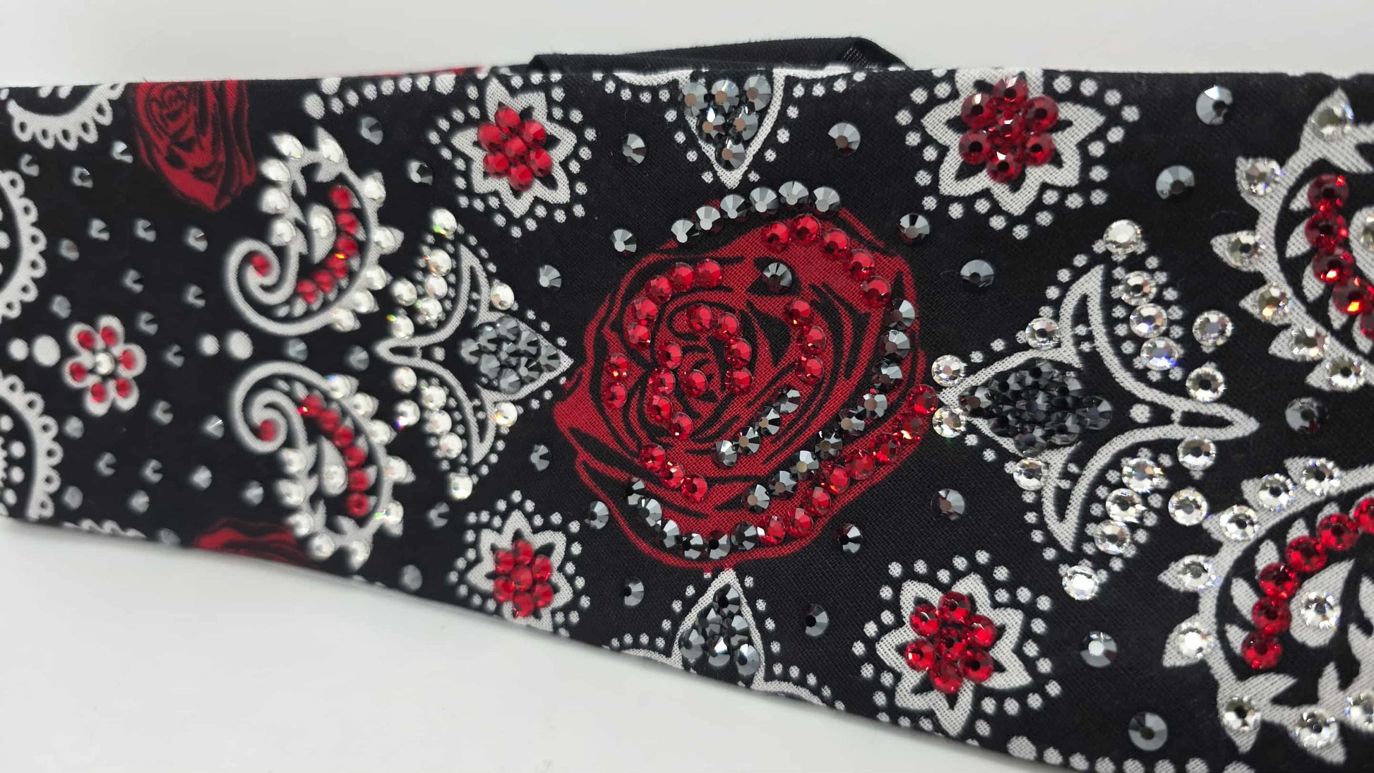 LeeAnnette Rose on Black Bandana with Red, Black and Diamond Clear Austrian Crystals (sku40110)