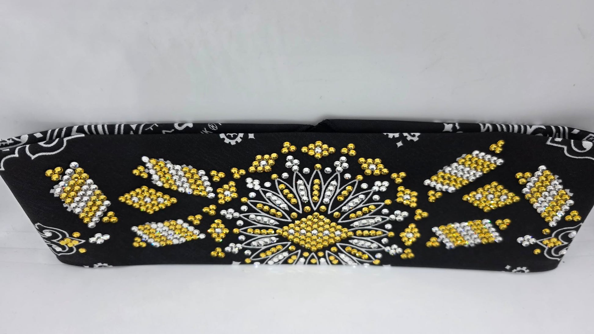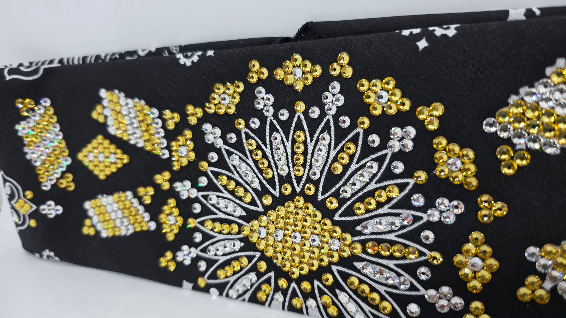 Rooted in timeless paisley artistry, this Super LeeAnnette bandana merges traditional design with modern luxury through its curated crystal embellishment. Golden yellow and diamond clear Austrian crystals are positioned to maximize light refraction across the rich black foundation, creating visual depth without overwhelming the pattern. The construction prioritizes longevity—each stone is secured to endure regular use while preserving the fabric's structural integrity and luminous quality. A sophisticated accessory for those who appreciate heritage craftsmanship paired with contemporary elegance.