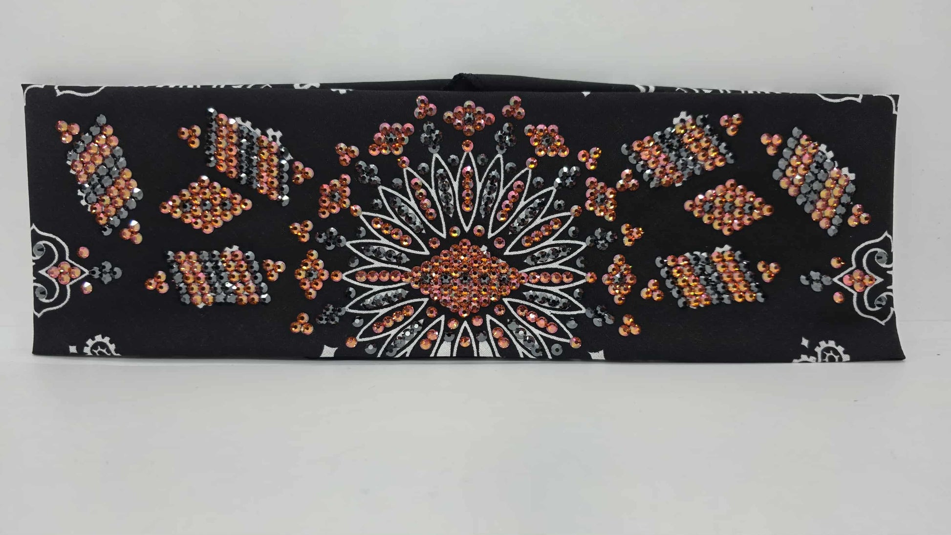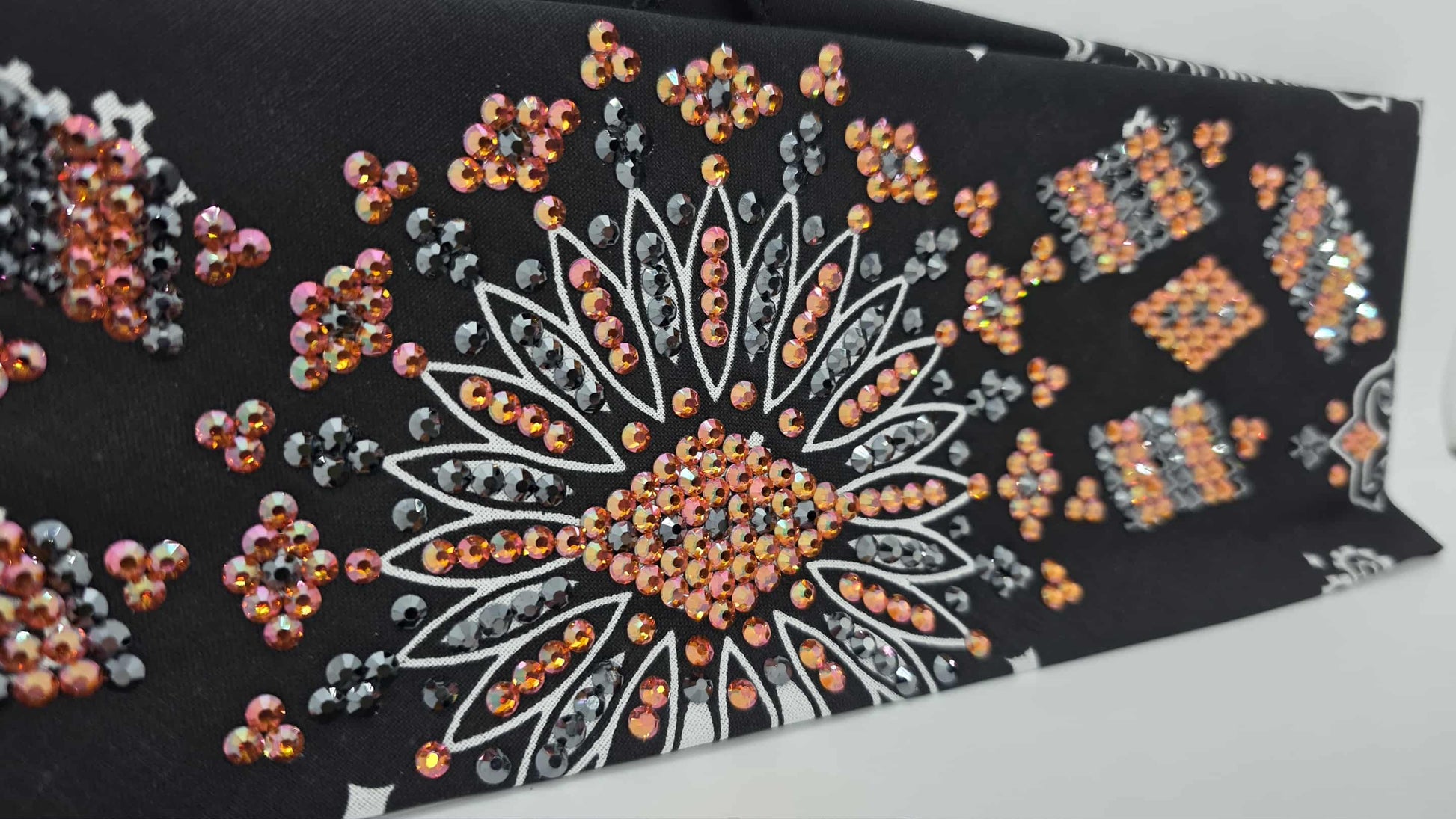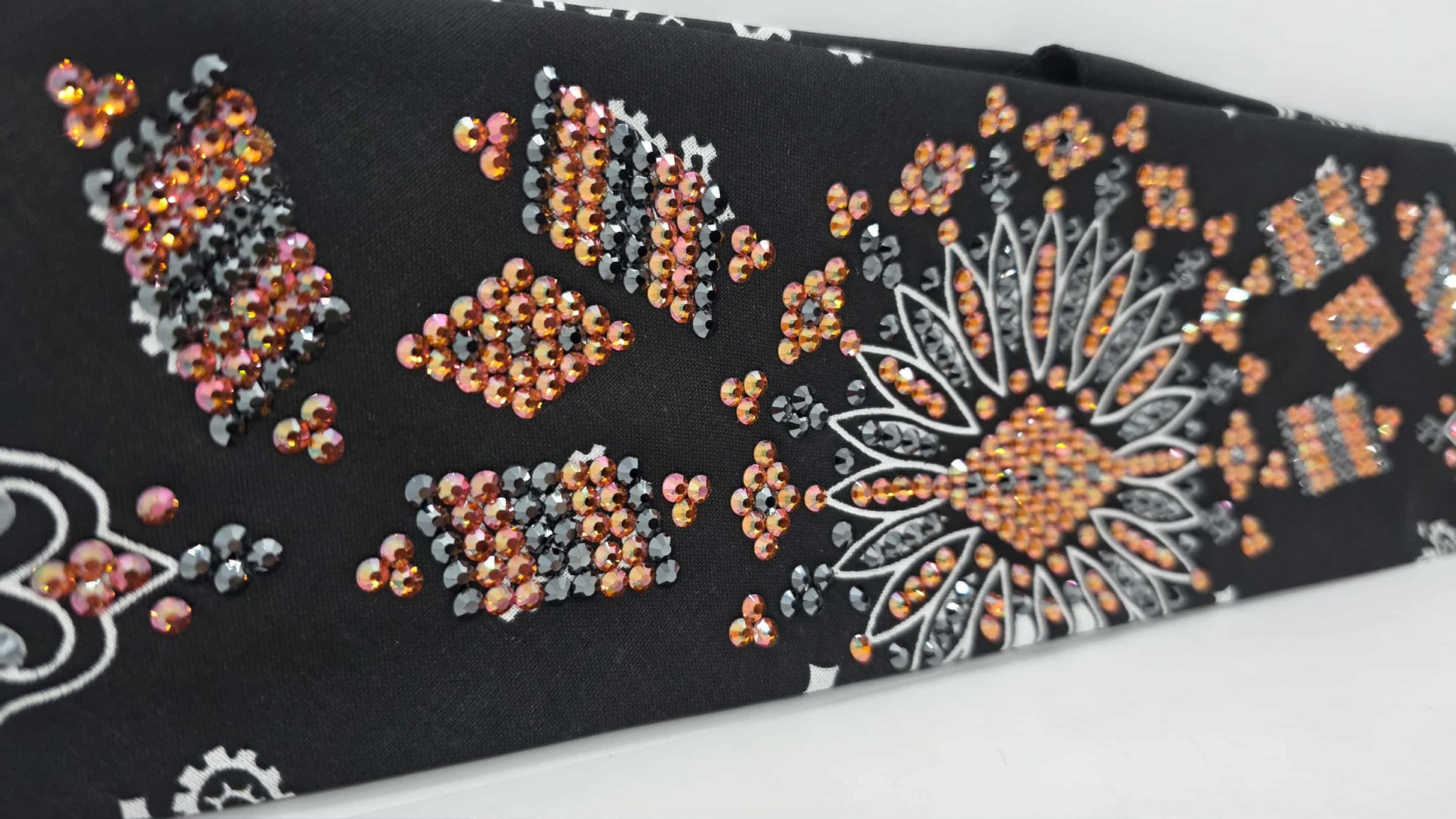 This striking bandana showcases an intricate black paisley pattern elevated by the sophisticated interplay of Black and Lava Austrian Crystals, creating a mesmerizing depth of light and shadow. Crafted from premium, resilient fabric, it delivers both lasting durability and comfort whether worn as a daily accessory or for special occasions. The expertly placed crystal embellishments transform a classic design into a contemporary statement piece that commands attention while maintaining refined elegance. Perfect for those seeking a versatile accessory that combines artisanal quality with bold, distinctive style.