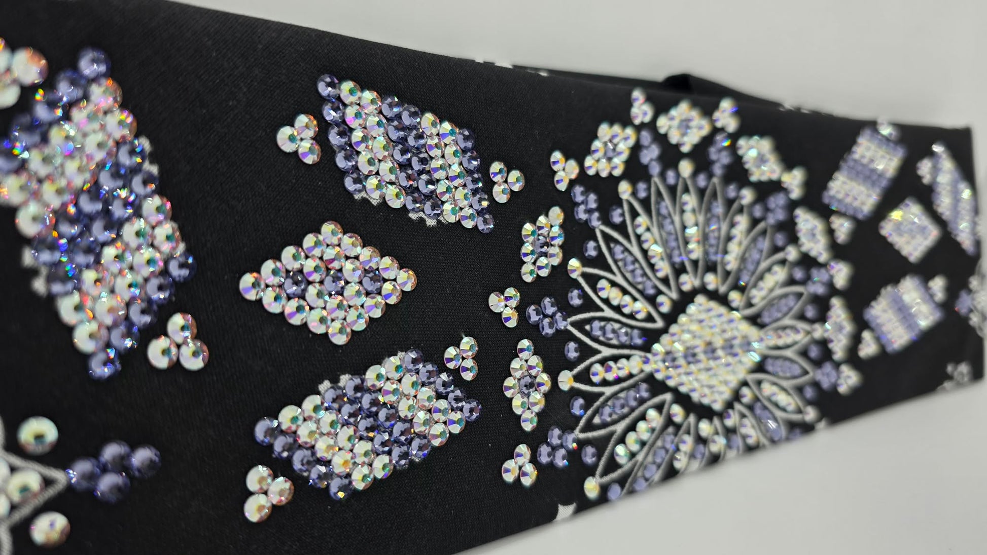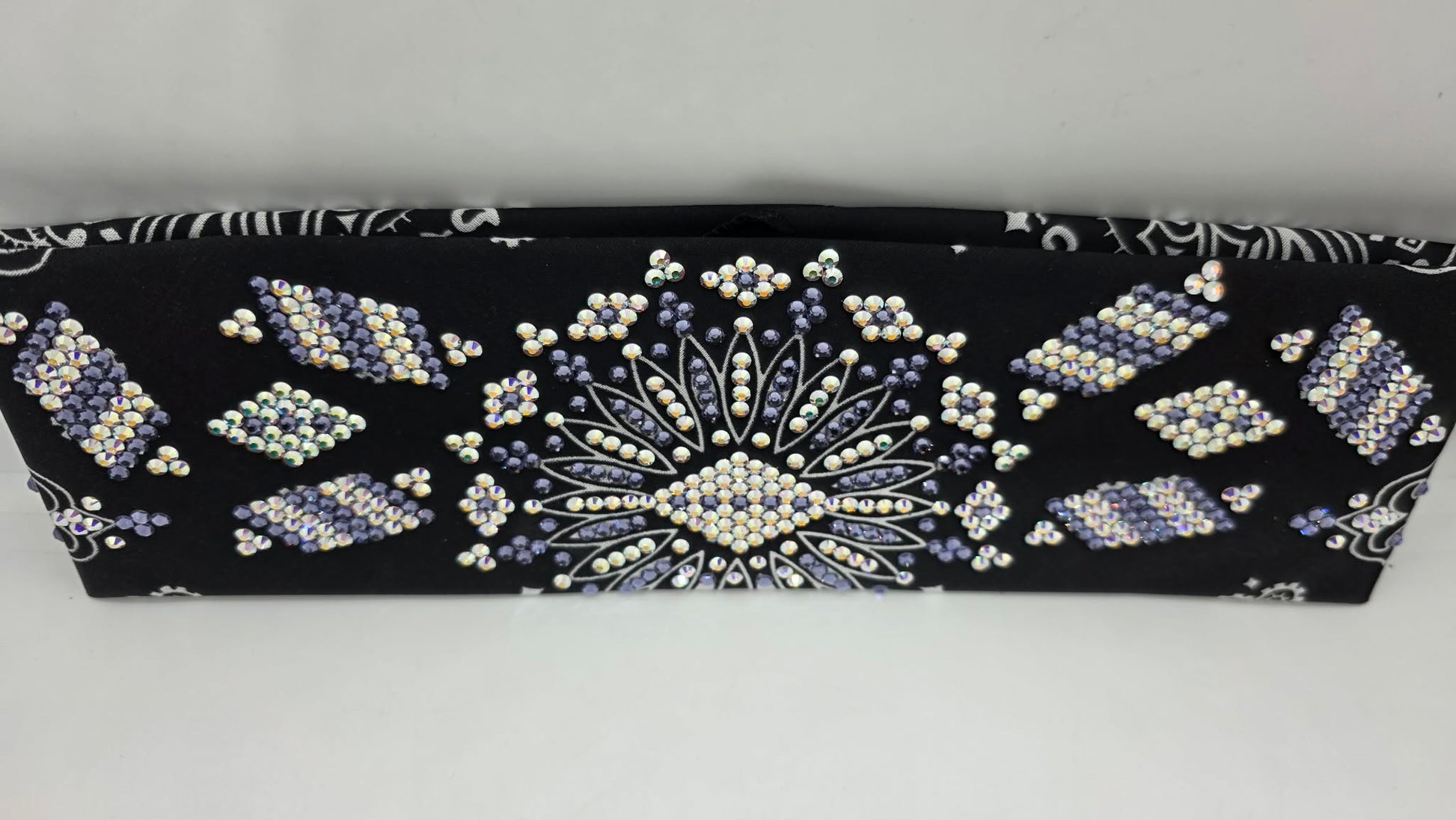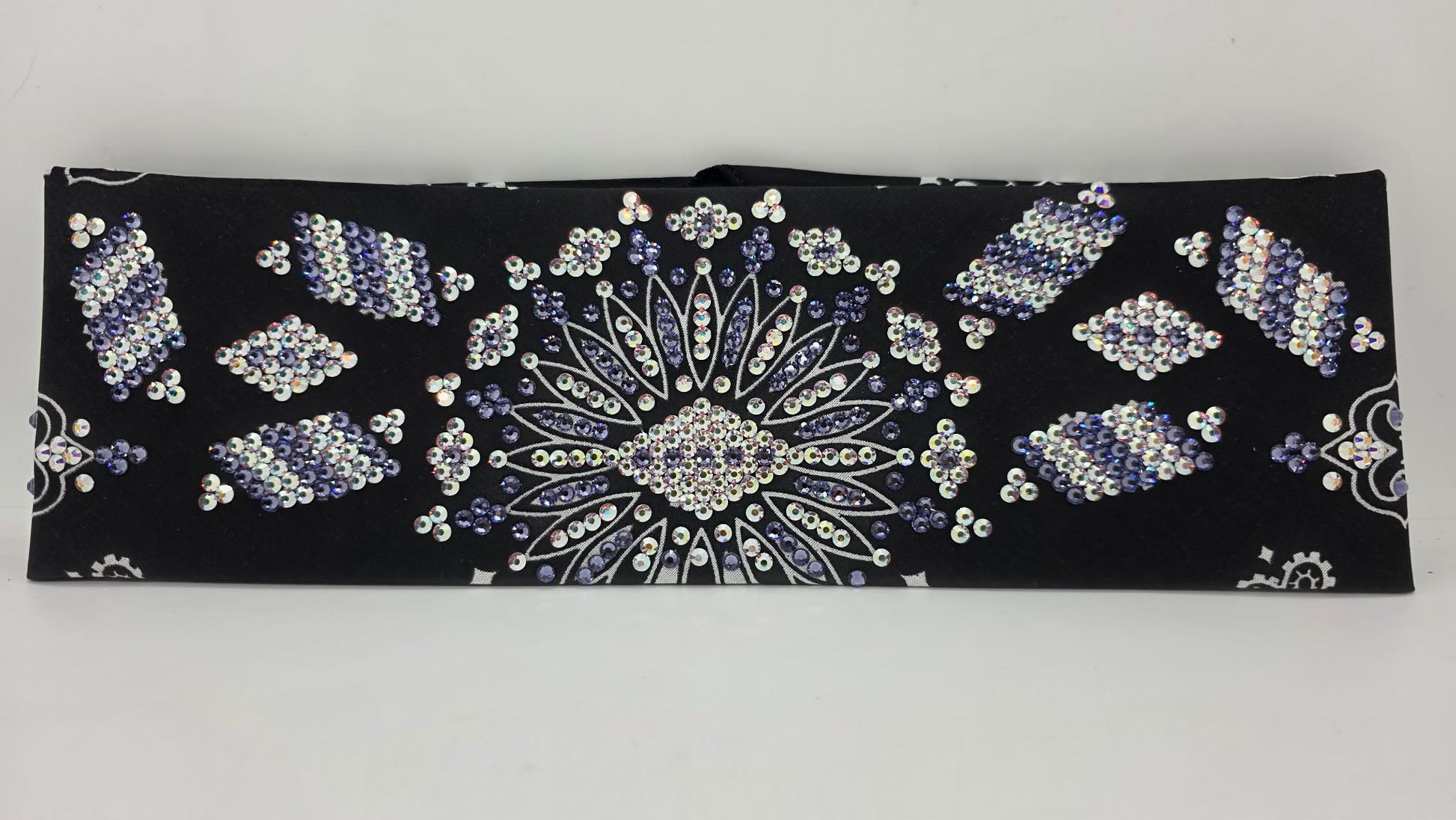 This Super LeeAnnette bandana showcases hand-applied Aurora Borealis and light purple Austrian crystals arranged across a black paisley weave. The Aurora Borealis stones shift with light, creating an iridescent effect that elevates the classic paisley pattern. Engineered for longevity, the crystal placement withstands everyday wear without compromising brilliance. A sophisticated fusion of heritage design and modern embellishment, this piece delivers refined style for those seeking premium craftsmanship and distinctive visual presence in their accessory wardrobe.
