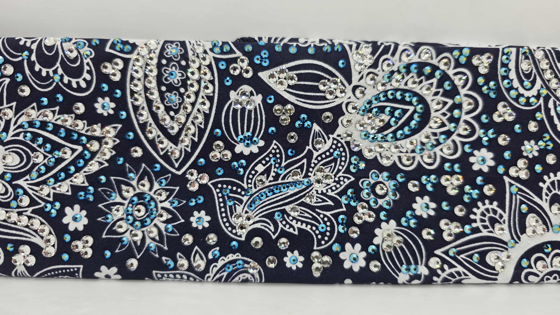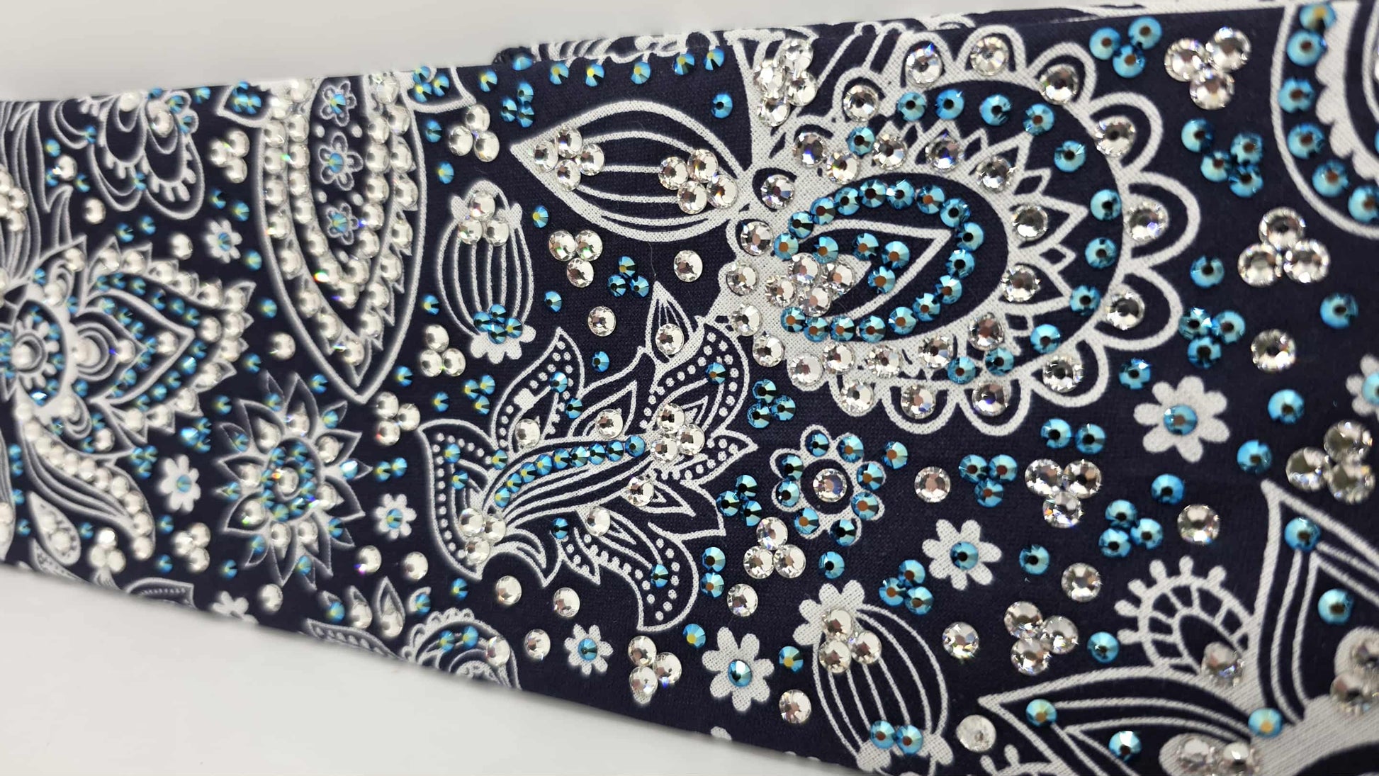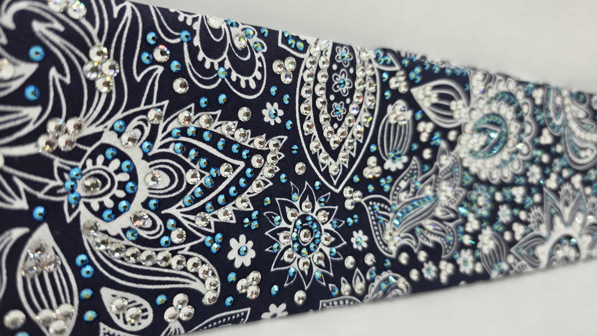 Elevate your accessory collection with the Super LeeAnnette Fancy Blue Paisley Bandana, meticulously crafted to blend timeless elegance with modern flair. Featuring a rich blue paisley pattern enhanced by a subtle black shimmer, this bandana is adorned with over 900 diamond-clear and black shimmer Austrian crystals, adding a dazzling sparkle that catches the light from every angle. Made from premium, durable fabric, it ensures both comfort and longevity, making it perfect for daily wear or special occasions. This exquisite piece offers a sophisticated touch to any outfit, reflecting expert craftsmanship and attention to detail.