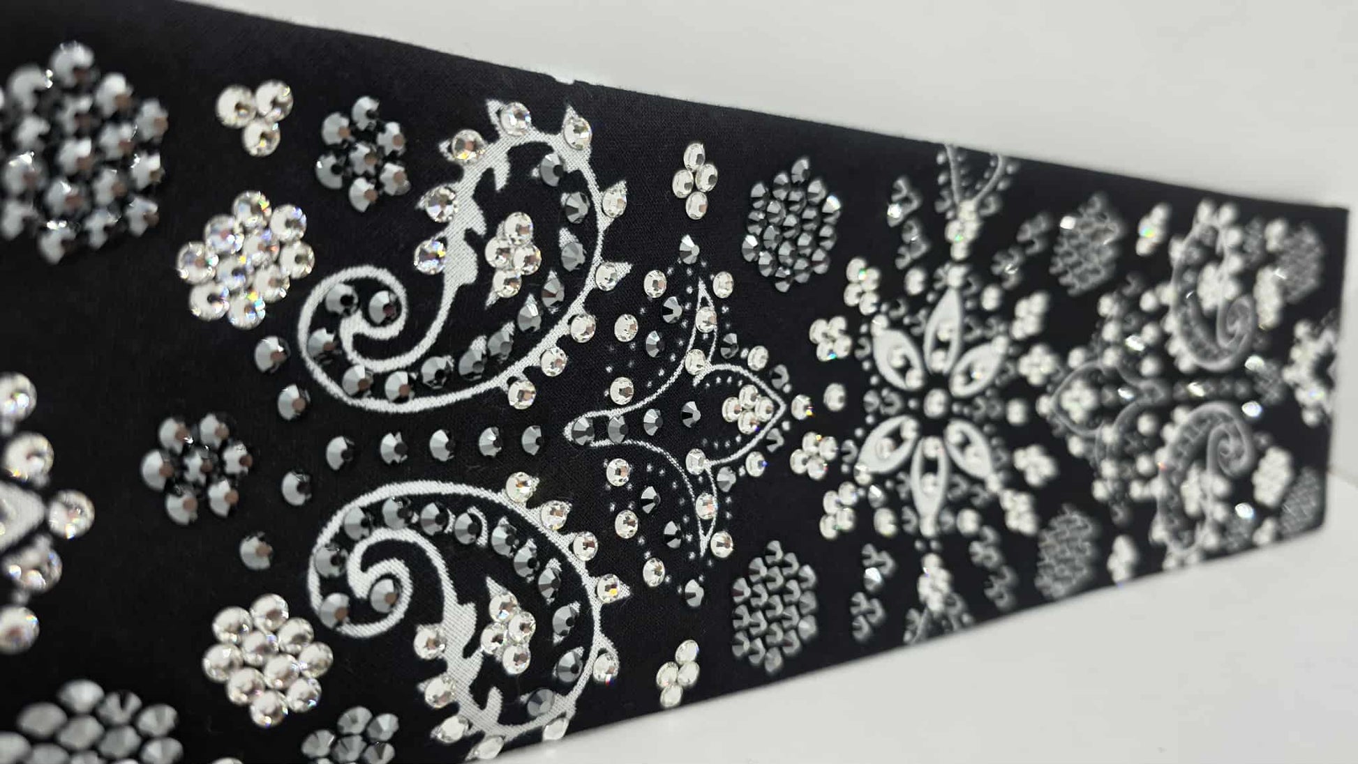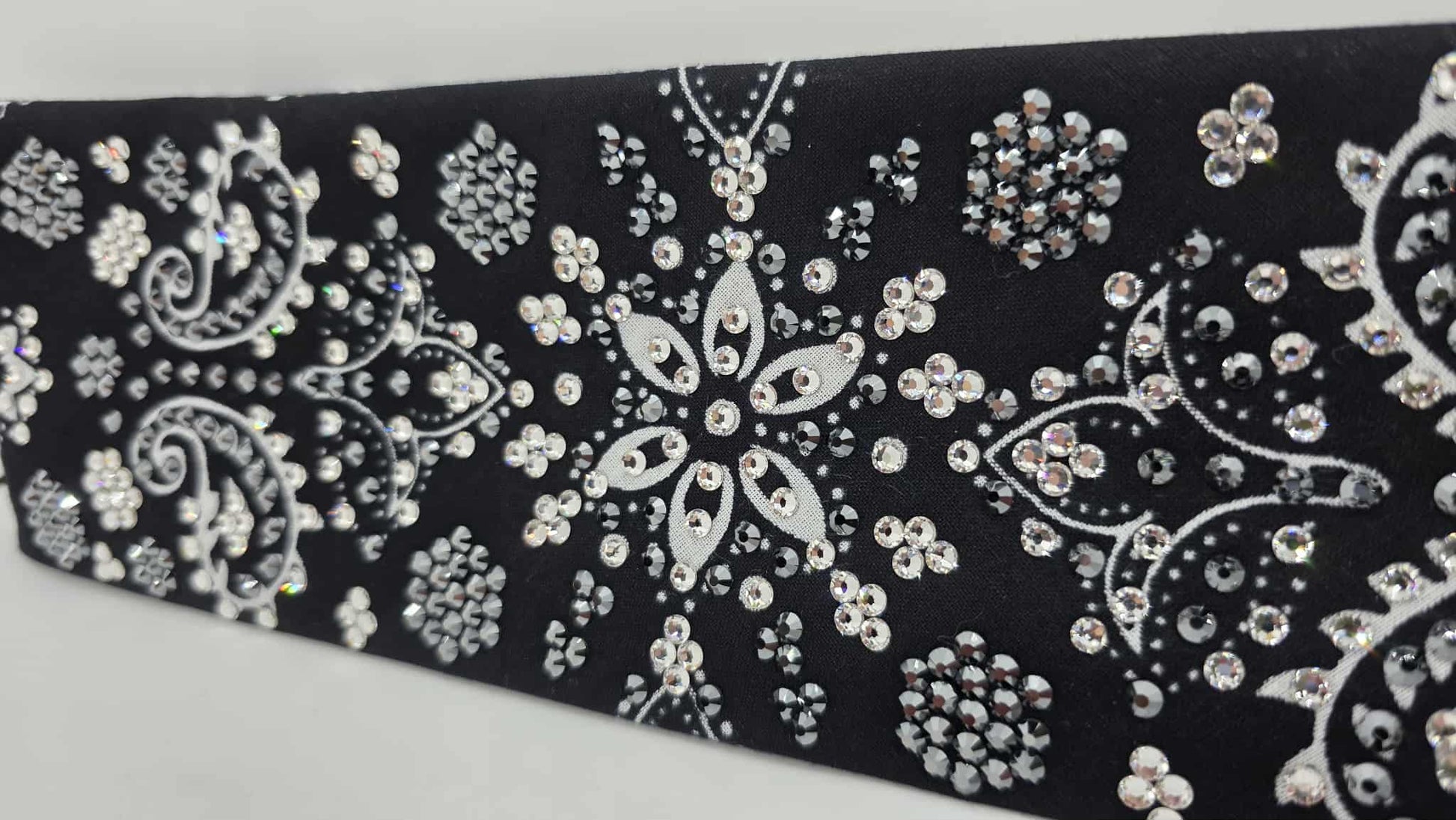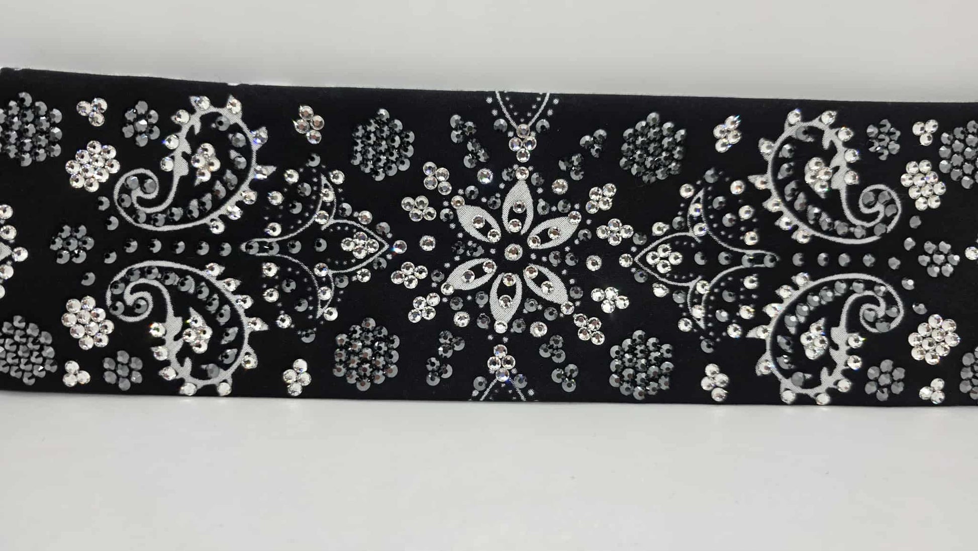 The Super LeeAnnette Large Black Flower Bandana is expertly designed with strategically placed Black and Diamond Clear Austrian Crystals that maximize light reflection, producing a mesmerizing, multidimensional sparkle. Crafted from premium, durable fabric, it ensures lasting comfort and resilience whether worn daily or for special occasions. The bandana features a detailed paisley pattern, enhanced by the brilliant crystals, blending classic sophistication with modern style. This versatile accessory is perfect for elevating any ensemble, showcasing meticulous craftsmanship and a striking visual presence that makes a distinctive fashion statement.