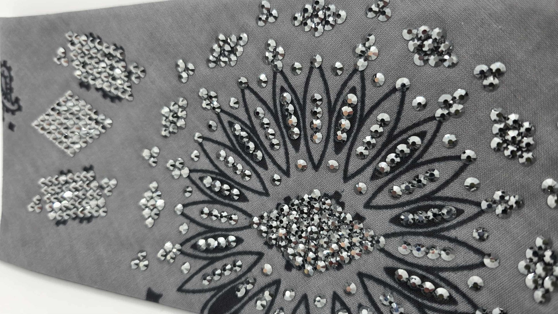 The Super LeeAnnette Large Grey Bandana is adorned with over 600 hand-applied Black Austrian Crystals that amplify light reflection, creating a captivating, multidimensional shimmer. Made from high-quality, durable fabric, it offers lasting comfort and strength for everyday wear or special events. Featuring an intricate paisley design accentuated by sparkling crystals, this bandana combines timeless elegance with contemporary flair. A versatile accessory, it elevates any outfit with expert craftsmanship and a bold, standout appearance that delivers a unique fashion statement.