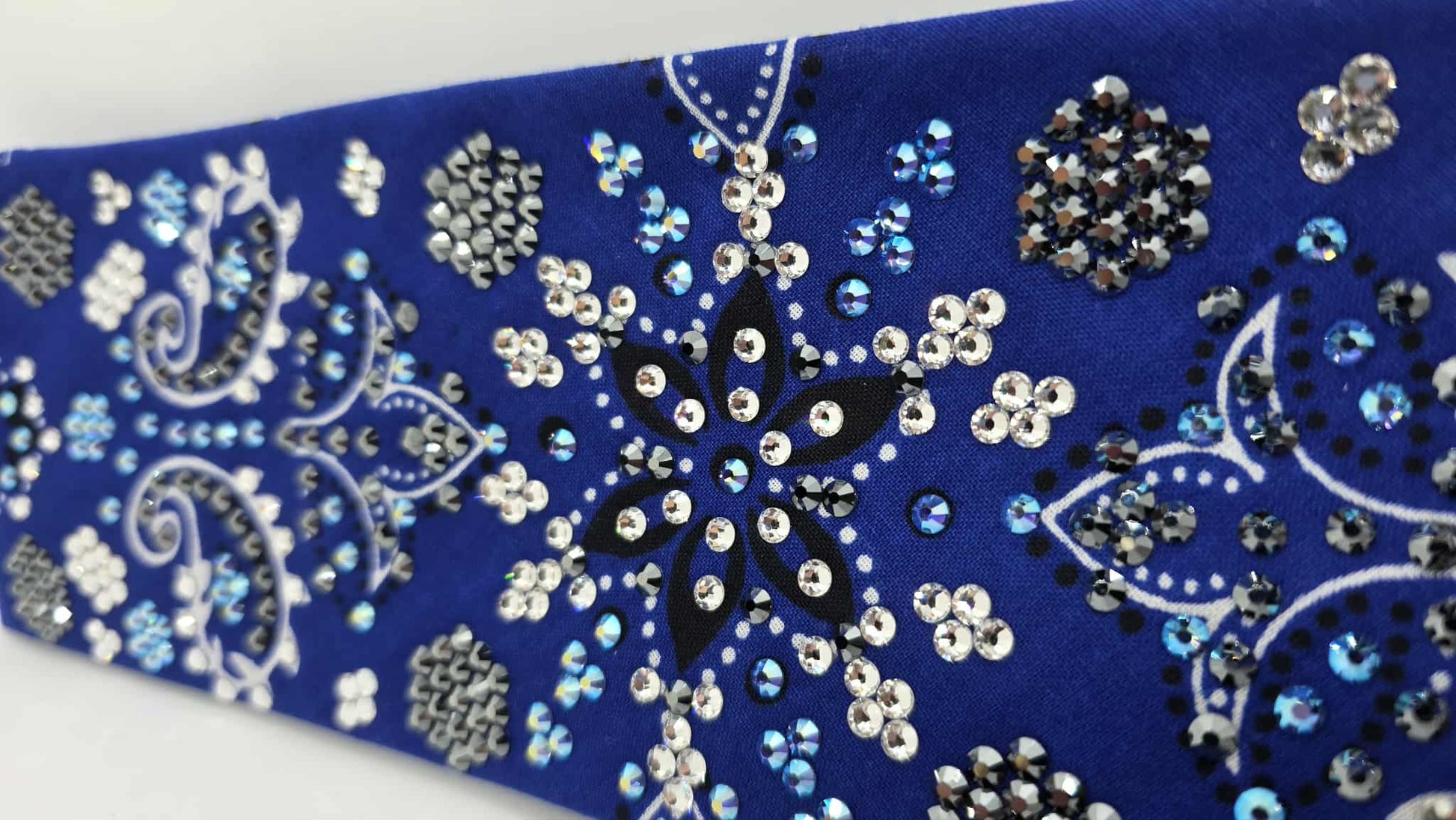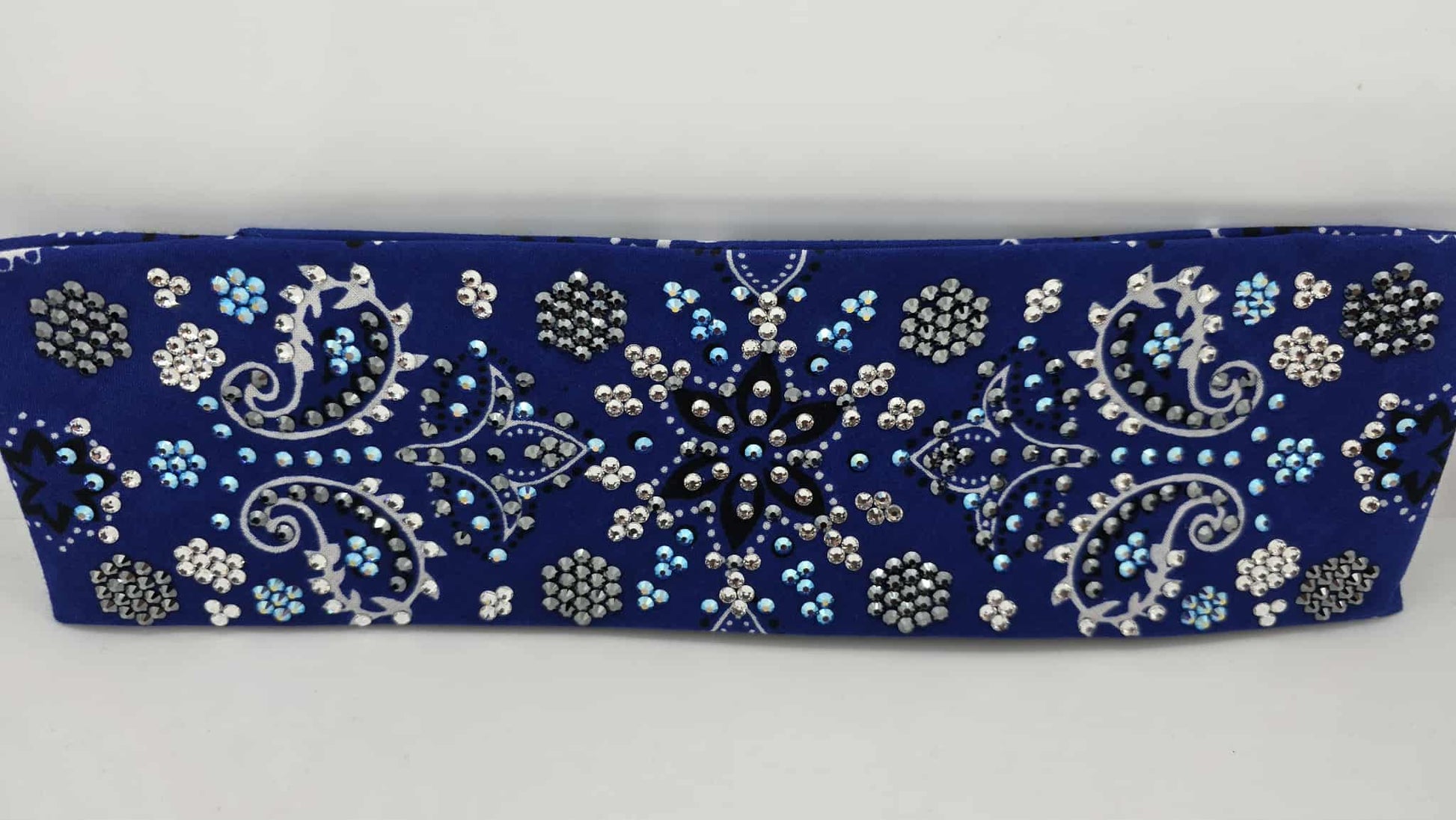 The Super LeeAnnette Large Royal Blue Flower Bandana features over 600 hand-applied Blue Shimmer, Black, and Diamond Clear Austrian Crystals that brilliantly capture light, creating a vivid, multi-dimensional sparkle visible from every angle. The Blue Shimmer crystals offer an intriguing color shift between purple and blue, enhancing its rich floral and paisley design. Crafted from premium, durable fabric, it delivers comfort and resilience for daily wear or special occasions. With its generous size and sturdy construction, this bandana can be styled as a headscarf, neck accessory, or layered statement piece, showcasing exceptional craftsmanship and timeless elegance.